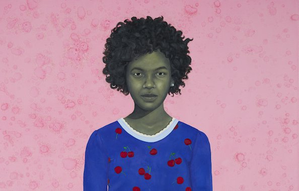 Sherald’s portraits are distinctive images of (thus far) everyday black people she meets. She renders black skin in striking, almost monochromatic grey tones. The artist told the New York Times that she photographs subjects outside in natural light before painting, and that her process is slow and meticulous.